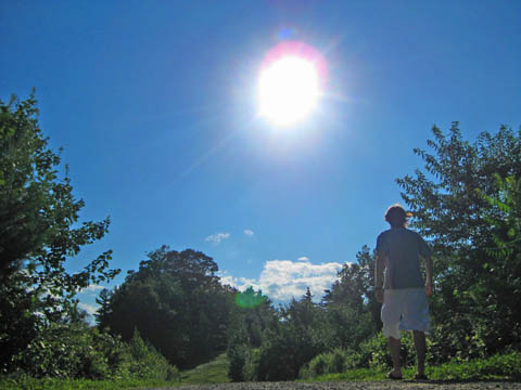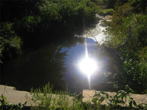 Als ich heute auf meinen Ex-Hausvater gewartet habe, (wir waren heute im Park Tennis spielen und anschließend Pizza essen) habe ich die Sonne im Wasser unter einer Brücke erwischt. Wenn man genau hinsieht, erkennt man in der Spieglung des Wassers sogar den wolkenfreien Himmel.