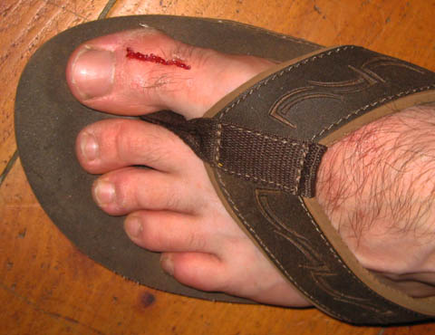 2cm lange Schnittwunde am Zeh , und fuhr fort mit dem Umzug.